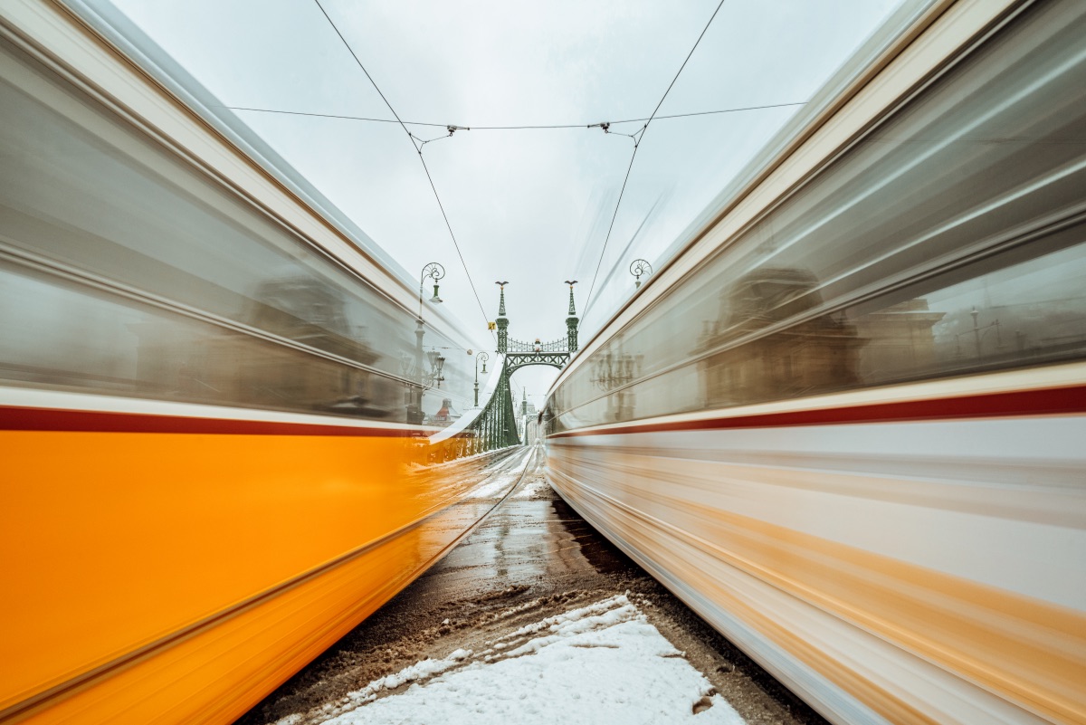 Urban photograph of two trams in front of the Liberty Bridge. Taken in Budapest, Hungary by the Hamburg based urban photographer dudewithcamera.
